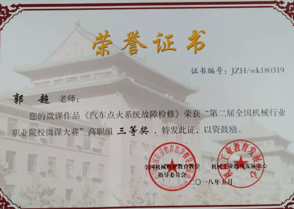 机电工程系周燕、李小龙老师的微课作品《机件的综合表达方法之投影视图》在“第二届全国机械行业职业院校微课大赛”荣获高职组二等奖;汽车工程系郭超老师的微课作品《汽车点火系统故障检修》荣获高职组三等奖。